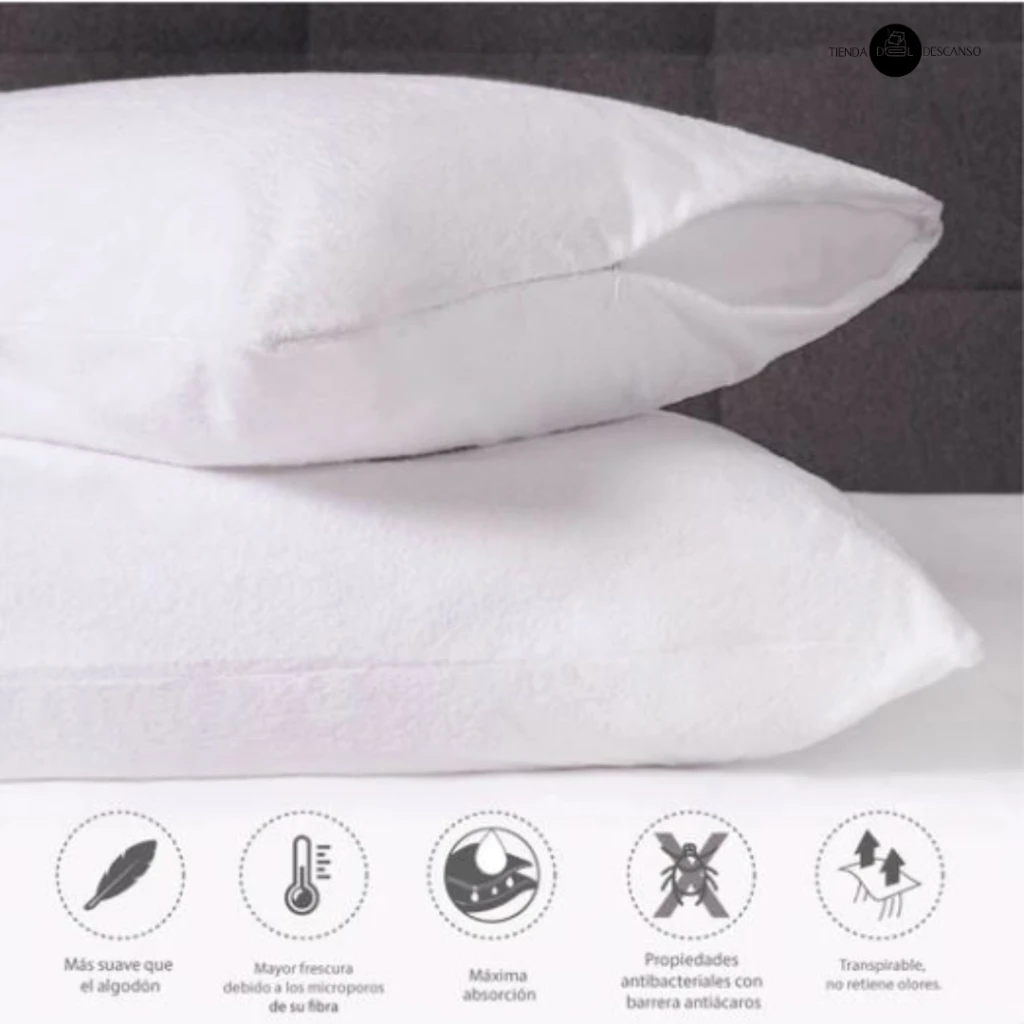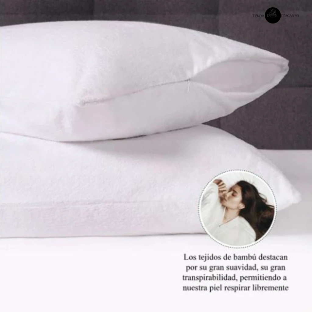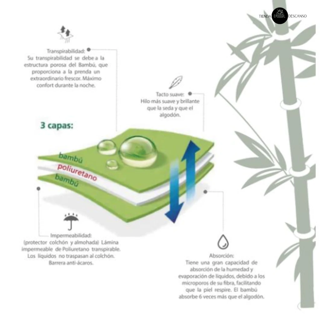 El protector Bambú almohada con cremallera es 6 veces más absorbente y suave que el algodón, con alto grado de transpirabilidad y una membrana interna de poliuretano (PU) el cual permite que el vapor de agua se elimine, impidiendo que se acumule en la superficie. Igualmente, al ser 100% impermeable, evita que los accidentes líquidos lleguen a la almohada.