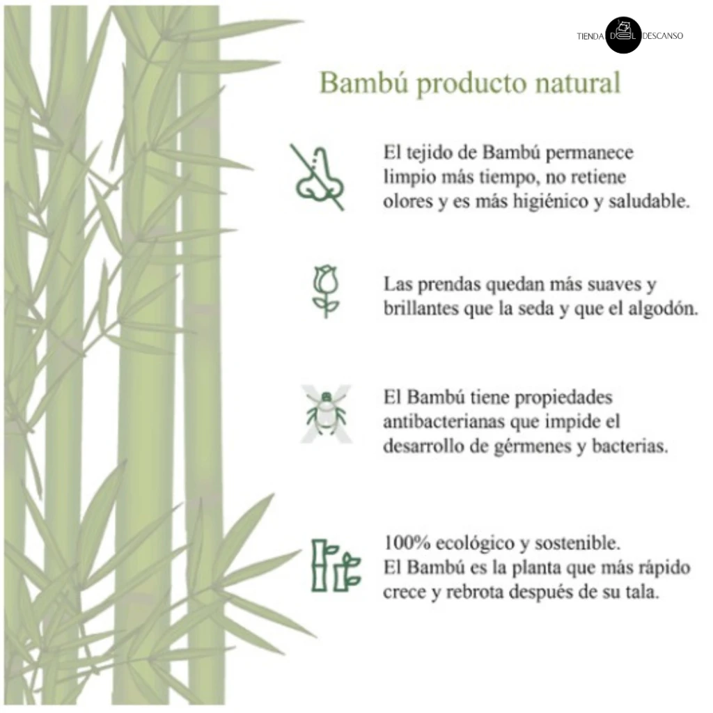 El tejido de bambú y sus propiedades brindan doble protección antibacteriana impidiendo el desarrollo de gérmenes y bacterias, permanece limpio más tiempo, no retiene olores, es más higiénico, saludable, 100% ecológico y sostenible.